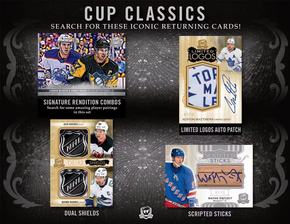 - Cup Trios, Quads & Sixes (Jersey): These multi-player, multi-mem cards are a hit with collectors. All cards are #’d to 35 or less and the Patch (#’d to 10 or less), Tag (#’d to 2) and Button (#’d 1-of-1) parallels of each are always extra-special pulls.
