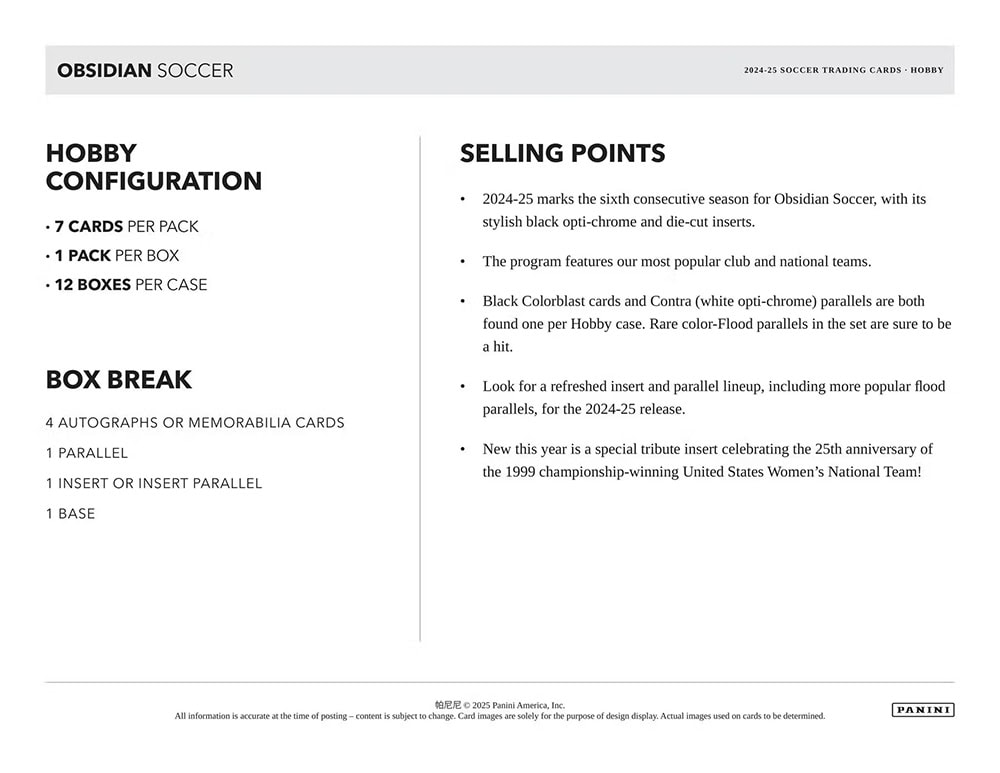 Each 2024-25 Panini Obsidian Soccer Hobby Box contains 4 Autographs or Memorabilia Cards, 1 Parallel, 1 Insert or Insert Parallel, and 1 Base, on average!