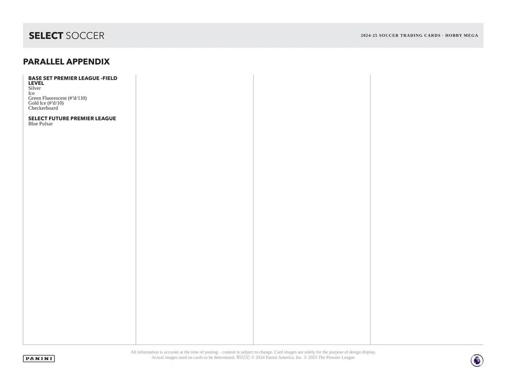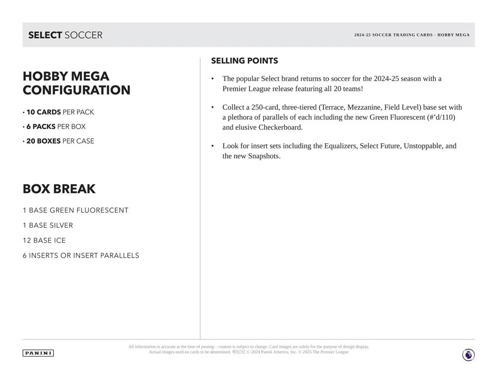 Each 2024-25 Panini Select English Premier League Soccer Hobby Mega Box contains 1 Base Green Fluorescent Parallel, 1 Base Silver and more per box on average!