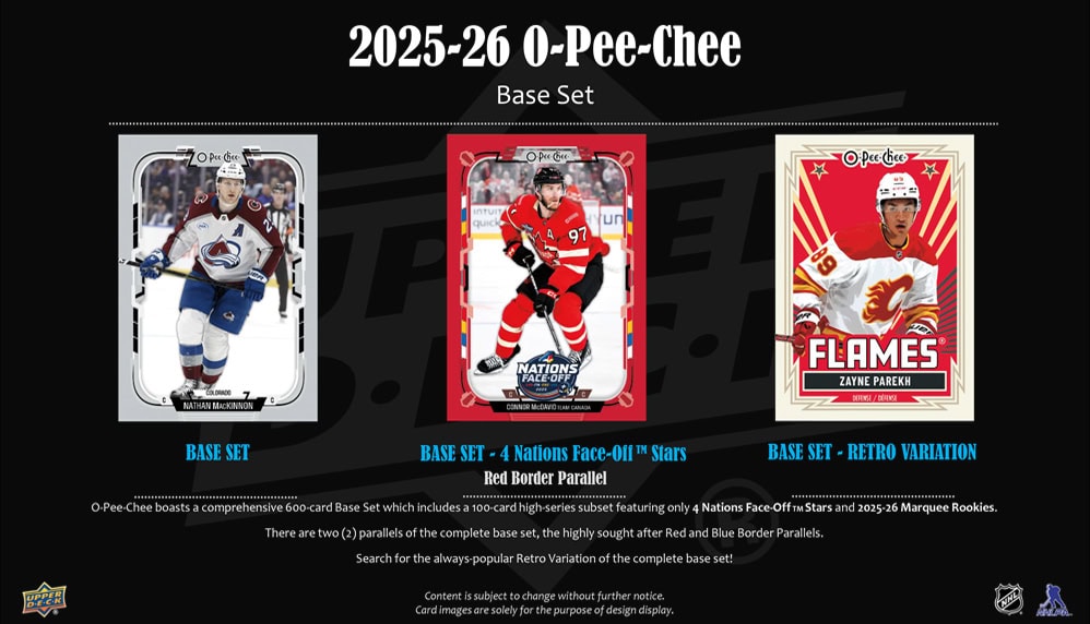 O-Pee-Chee boasts a comprehensive 600-card base set which includes a 100-card high-series subset featuring only 4 Nations Face-Off Stars and 2025-26 Marquee Rookies. Every box contains, on average, 4 All-Star and/or Marquee Rookie cards! There are 3 parallels of the complete base set, including a Blaster-exclusive Yellow Border parallel! Here is the parallel lineup: