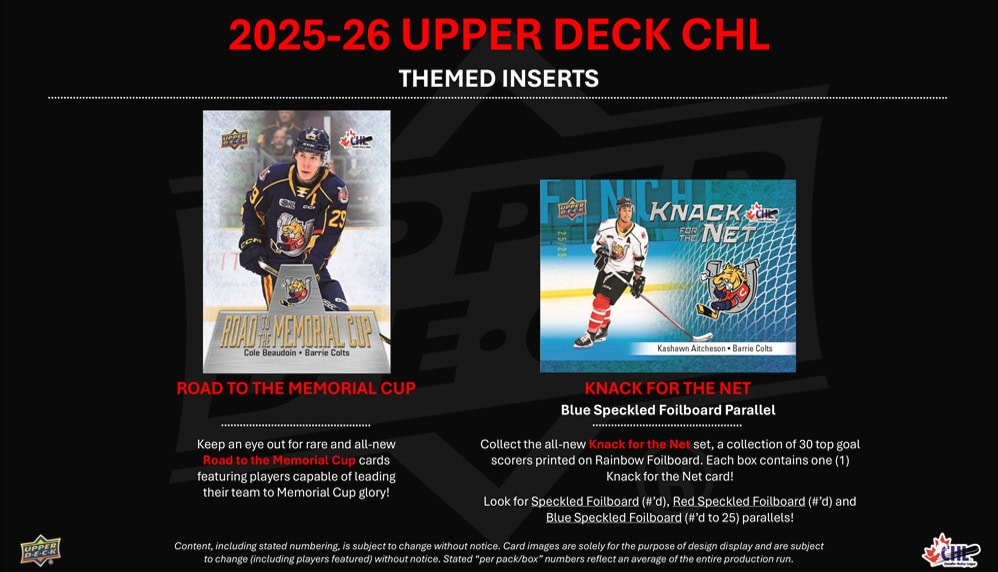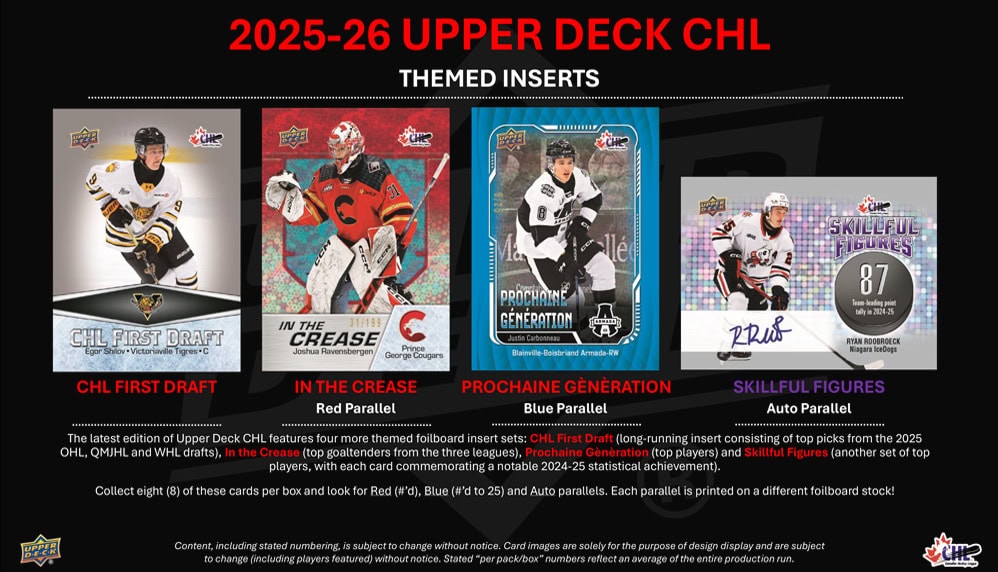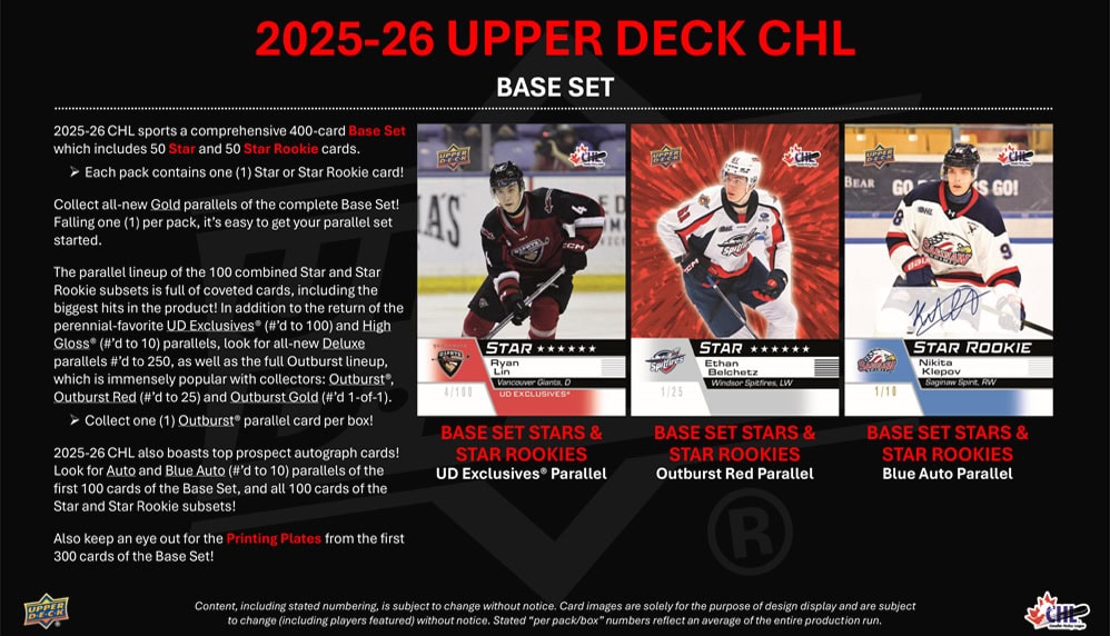 2025-26 CHL also boasts top prospect autograph cards! Look for Auto and Blue Auto (numbered to 10) parallels of the first 100 cards of the Base Set, and all 100 cards of the Star and Star Rookie subsets!