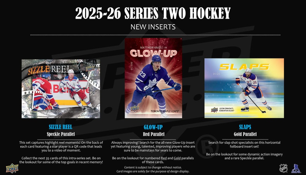 Series 2 sports the next 250 cards of the 2025-26 Upper Deck Base Set. Annually, the Upper Deck Base Set is the most widely-collected Base Set in hockey. It includes 198 veteran cards, 49 Young Guns® rookie cards and three checklist cards. The iconic Young Guns® are the most anticipated rookie cards of the season.