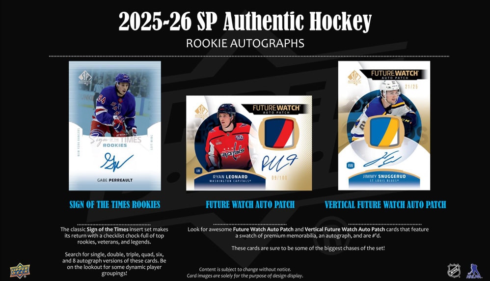 The popular SP Authentic base set features 100 star veterans and 100 Future Watch Rookies. The perennially-coveted Autograph Future Watch Rookies cards are #’d to 999 and feature an autograph! Every box contains, on average, at least one Autograph Future Watch Rookies card!