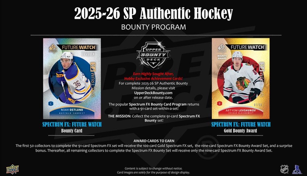 Award Cards to Earn: The first 50 collectors to complete the 91-card Spectrum FX set will receive the 100-card Gold Spectrum FX set, the nine-card Spectrum FX Bounty Award Set, and a surprise bonus. Thereafter, all remaining collectors to complete the Spectrum FX Bounty Set will receive only the nine-card Spectrum FX Bounty Award Set.