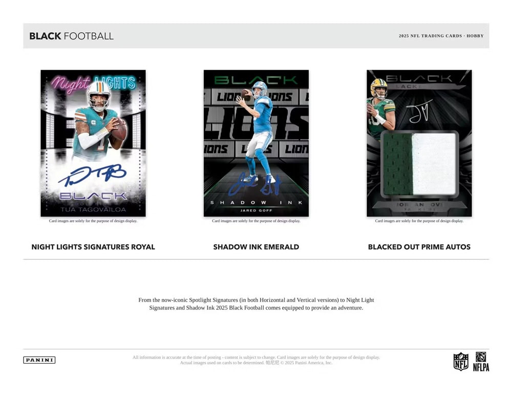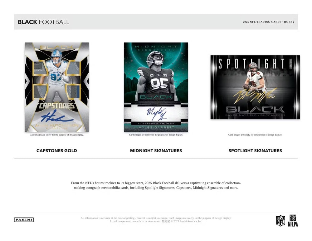 From the now-iconic Spotlight Signatures (in both Horizontal and Vertical versions) to stacked autograph-memorabilia content from the most desirable rookies, 2025 Black Football comes equipped to provide an adventure.