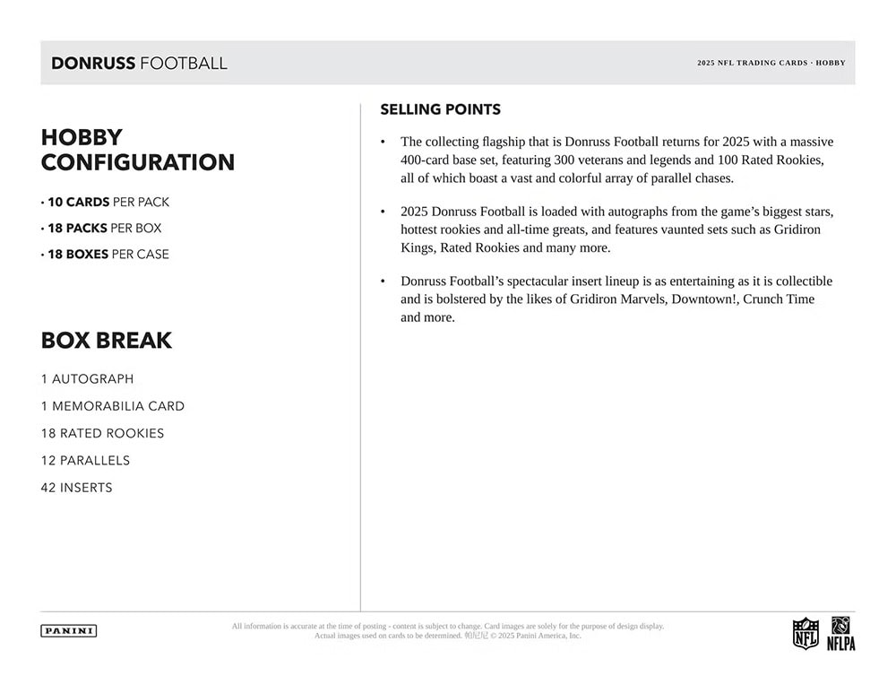 Each 2025 Panini Donruss Football Hobby Box contains 1 Autograph, 1 Memorabilia Card, 18 Rated Rookies, 12 Parallels, and 42 Inserts, on average!