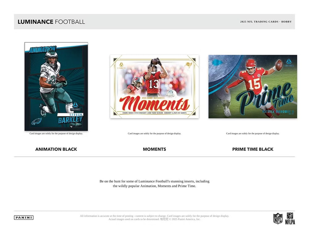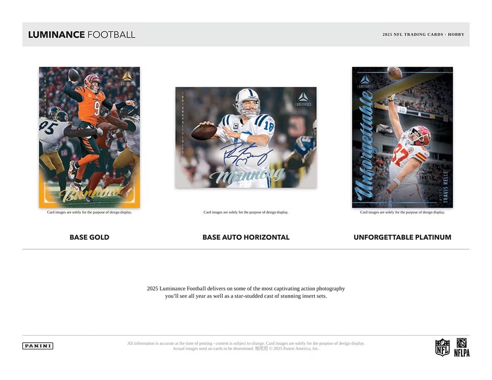 Each 2025 Panini Luminance Football Hobby Box contains 3 Autographs, 1 Memorabilia Card, 5 Parallels, 4 Inserts, and 12 Rookies, on average!