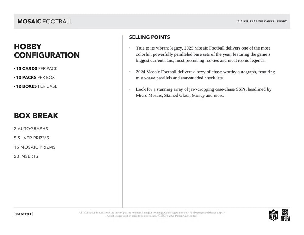 Each 2025 Panini Mosaic Football Hobby Box contains 2 Autographs, 5 Silver Prizms and more per box on average!