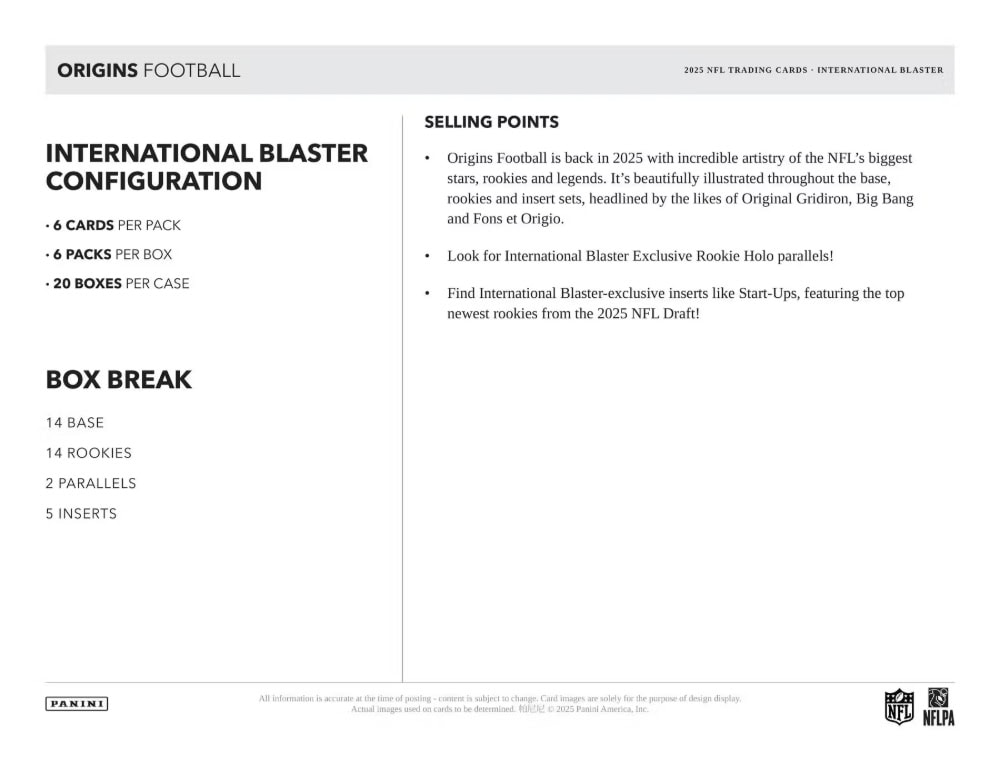 Each 2025 Panini Origins Football International Blaster Box contains 14 Base, 14 Rookies, 2 Parallels and 5 Inserts!