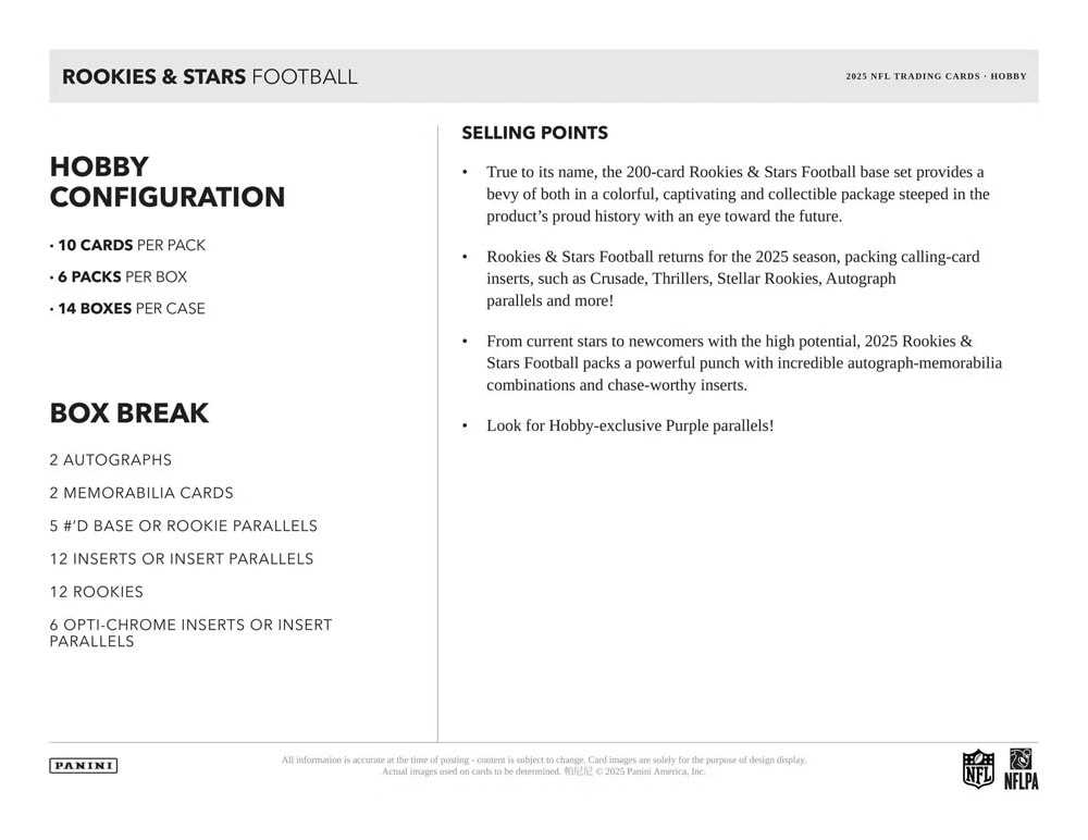 Rookies & Stars Football returns for the 2025 season, packing calling-card inserts, such as Crusade, Thrillers, Stellar Rookies, Autograph parallels and more!