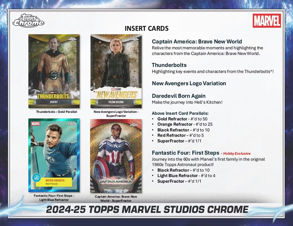 Each 2025 Topps Marvel Studios Chrome Value Box contains 4 Blaster Exclusive Parallels and 1 Thunderbolts Logo Variations per box on average!