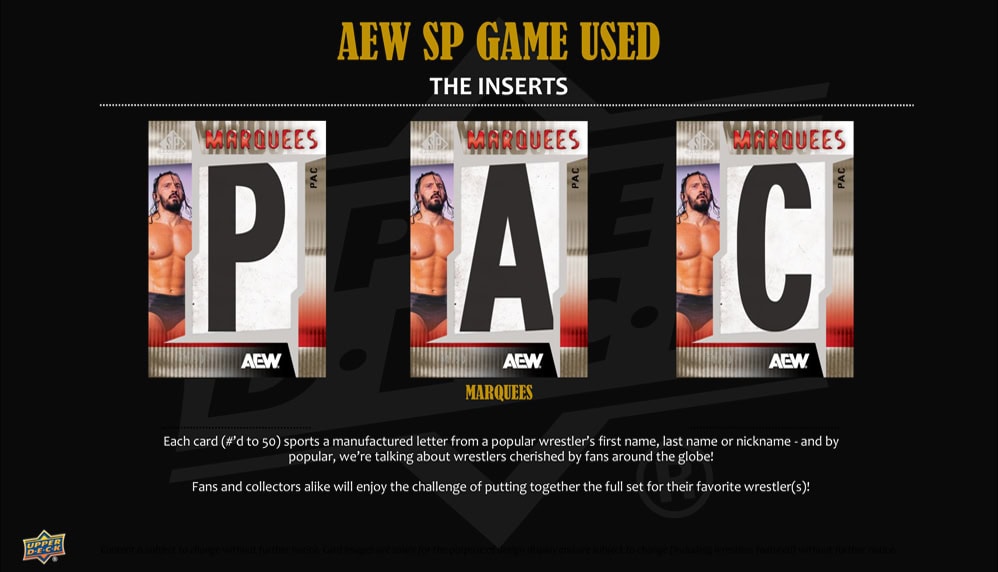 - Marquees: Each card (#’d to 50) sports a manufactured letter from a popular wrestler’s first name, last name or nickname – and by popular, we’re talking about wrestlers cherished by fans around the globe! Fans and collectors alike will enjoy the challenge of putting together the full set for their favorite wrestler(s)!
