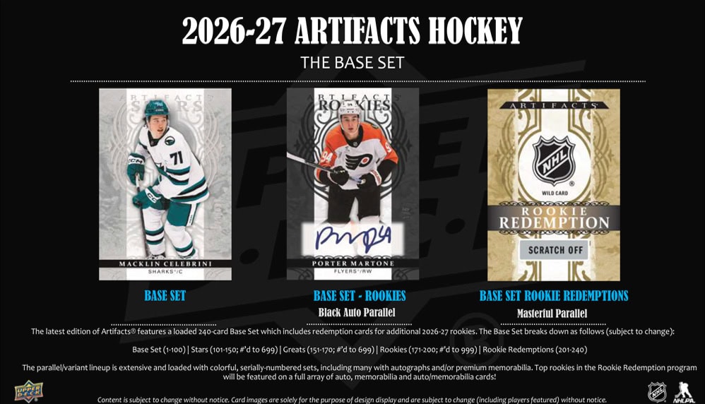 The latest edition of Artifacts® features a loaded 240-card base set which includes redemption cards for additional 2026-27 rookies. Collect the whole Base Set (1-100), Stars (101-150; numbered to 699), Greats (151-170; numbered to 699), Rookies (171-200; numbered to 999), and Rookie Redemptions (201-240).