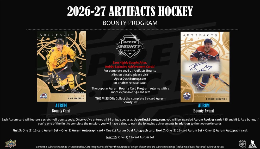 The Aurum Bounty Card Program returns with a 84-card set-within-a-set! To help wth your mission, Aurum cards are now found one per box! Collect the complete 84-card Aurum Bounty set! Each card will feature a scratch-off bounty code. Once you’ve entered all 84 unique codes, you will be awarded Aurum Rookie Bounty cards #85 and #86. As a bonus, those who complete this mission the fastest will have a shot to earn the following bonus achievements in addition to the two rookie cards: