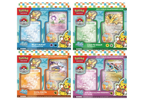 Grab a World Championships deck and play like a champion! Choose one of four powerful decks, each a card-for-card replica of an actual title-contender’s deck from the 2025 Pokémon Trading Card Game World Championships in Anaheim, California!