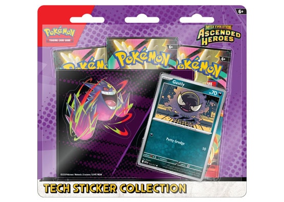 Each Pokemon Mega Evolution Ascended Heroes Gastly Tech Sticker Collection includes 3 booster packs and more!