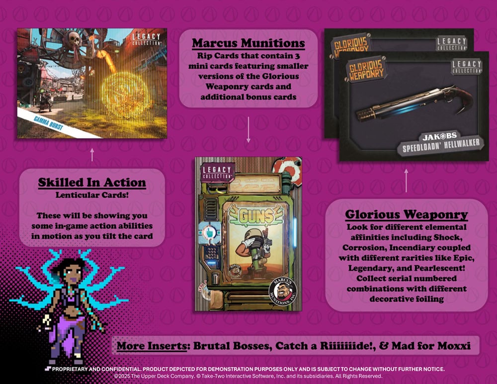 Each pack will contain on average 6 Base Set + Rare, Epic, or Legendary Parallel Card, 1 Monster Mayhem Card, 1 Glorious Weaponry Card, and 1 Additional Glorious Weaponry – Pearlescent Parallel, Marcus Munitions Inc., Skilled In Action, Bad Acetates, Brutal Bosses, Catch A Riiiiiide!, Character Select, Going Postal, Eternalized, or Mad for Moxxi card. Look for 1 Mad for Moxxi, 2 Brutal Bosses and/or Catch A Riiiiiide!, 2 Going Postal Cards, and 4 Serial Numbered Cards per box on average. Each case will contain an average of 1 Serial Numbered to 10 Card.
